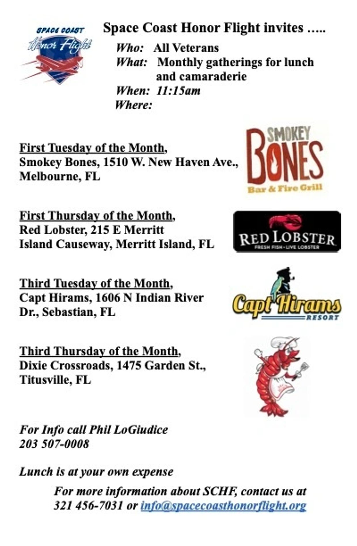 SCHF extends the camaraderie opportunities by hosting four monthly luncheons for Brevard & Indian River Veterans.  These luncheons attract 450 to 550 Veterans and friends each month.  Luncheons are geographically located from northern Indian River County to northern Brevard County.  Each month a  lunch is hosted  in Titusville, Merritt Island, Melbourne, and Sebastian. All Veterans, families and friends are invited.